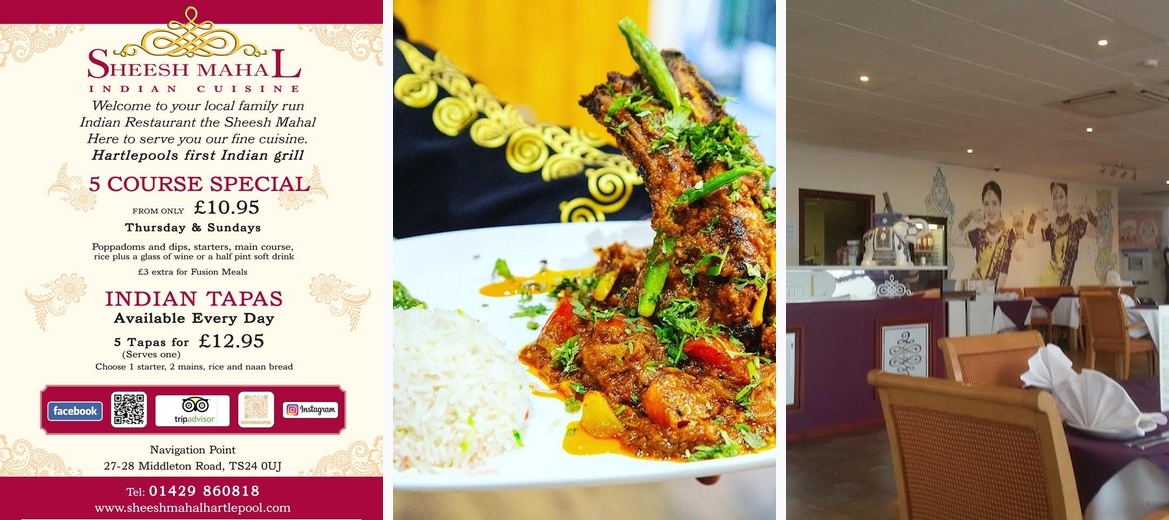 Indulge in the vibrant flavors of India at Sheesh Mahal Indian Restaurant in Hartlepool. Enjoy our affordable tapas, exceptional service, and convenient takeaway options. Experience a delightful 5-course meal in a welcoming atmosphere with ample parking. Call us at +44 1429 860818 to reserve your table today!